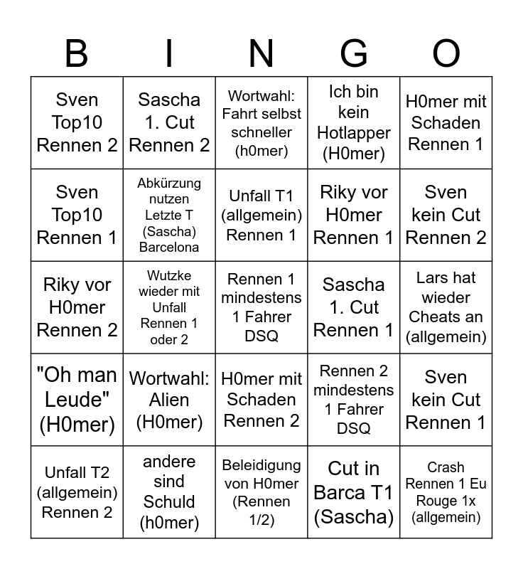 This bingo card has a free space and 24 words: Wortwahl: Alien (H0mer), andere sind Schuld (h0mer), Unfall T1 (allgemein) Rennen 1, Unfall T2 (allgemein) Rennen 2, H0mer mit Schaden Rennen 1, Sven Top10 Rennen 2, Sven Top10 Rennen 1, Sascha 1. Cut Rennen 2, Sascha 1. Cut Rennen 1, H0mer mit Schaden Rennen 2, Riky vor H0mer Rennen 1, Riky vor H0mer Rennen 2, Rennen 2 mindestens 1 Fahrer DSQ, Sven kein Cut Rennen 1, Abkürzung nutzen Letzte T (Sascha) Barcelona, Cut in Barca T1 (Sascha), Lars hat wieder Cheats an (allgemein), Wortwahl: Fahrt selbst schneller (h0mer), Sven kein Cut Rennen 2, Wutzke wieder mit Unfall Rennen 1 oder 2, Crash Rennen 1 Eu Rouge 1x (allgemein), "Oh man Leude"(H0mer), Ich bin kein Hotlapper (H0mer) and Beleidigung von H0mer (Rennen 1/2).