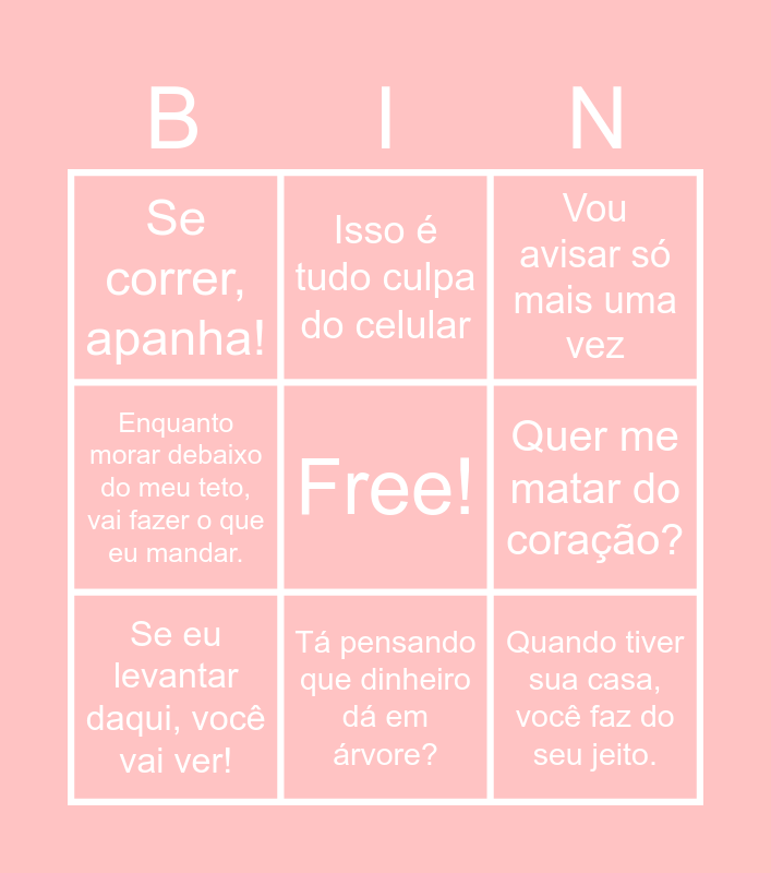 This bingo card has a free space and 35 words: Você não é todo mundo, tá ouvindo?, Na volta a gente compra, Não tô gritando, tô falando alto!, Se eu levantar daqui, você vai ver!, Engole esse choro, menino(a)!, Enquanto morar debaixo do meu teto, vai fazer o que eu mandar., Quer me matar do coração?, Tá achando que eu sou palhaça?, Tá pensando que dinheiro dá em árvore?, Não fez mais que a sua obrigação., Só vou contar até três…, Quando tiver sua casa, você faz do seu jeito., Desliga esse celular agora!, Me respeita que eu sou tua mãe!, Se correr, apanha!, Se cair, não vem chorar depois, Tô com cara de banco, é?, Se eu for aí e achar, você vai ver., Come tudo, hein! Nada de deixar no prato., Tá achando que eu sou tua pariceira?!, Quer que eu desenhe?, Já tá deitado(a) a essa hora?, Já arrumou esse quarto?, Quando você tiver filho, você vai ver., Vou avisar só mais uma vez, Quer ajuda ou quer que eu faça por você?, Enquanto tiver comida na mesa, ninguém morre de fome., Vai dormir, já deu sua hora!, Cuidado, menino! Vai quebrar a casa., Tira esse pé sujo de cima do sofá!, Não vou falar de novo!, Se eu sumir um dia, vocês vão dar valor., Minha paciência tá por um fio!, Isso é tudo culpa do celular and Passa o dia todinho na frente do celular daqui a pouco tá com a vista doendo..