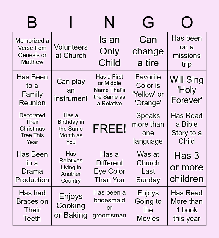 This bingo card has a free space and 24 words: Has had Braces on Their Teeth, Has Relatives Living in Another Country, Has a First or Middle Name That's the Same as a Relative, Enjoys Going to the Movies, Has been on a missions trip, Memorized a Verse from Genesis or Matthew, Volunteers at Church, Is an Only Child, Speaks more than one language, Has Read a Bible Story to a Child, Decorated Their Christmas Tree This Year, Can play an instrument, Was at Church Last Sunday, Has 3 or more children, Has Been to a Family Reunion, Enjoys Cooking or Baking, Has been a bridesmaid or groomsman, Can change a tire, Will Sing 'Holy Forever', Has Been in a Drama Production, Has a Birthday in the Same Month as You, Has a Different Eye Color Than You, Favorite Color is 'Yellow' or 'Orange' and Has Read More than 1 book this year.