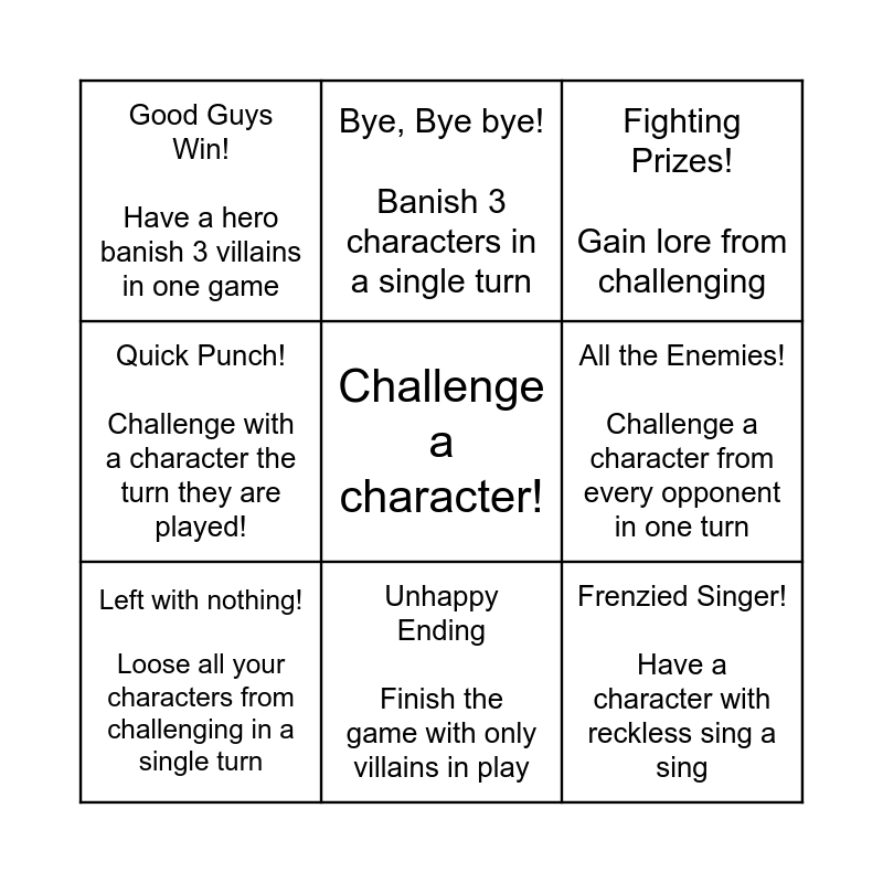 This bingo card has a free space and 8 words: All the Enemies! Challenge a character from every opponent in one turn, Fighting Prizes! Gain lore from challenging, Bye, Bye bye! Banish 3 characters in a single turn, Left with nothing! Loose all your characters from challenging in a single turn, Good Guys Win! Have a hero banish 3 villains in one game, Frenzied Singer! Have a character with reckless sing a sing, Quick Punch! Challenge with a character the turn they are played! and Unhappy Ending Finish the game with only villains in play.