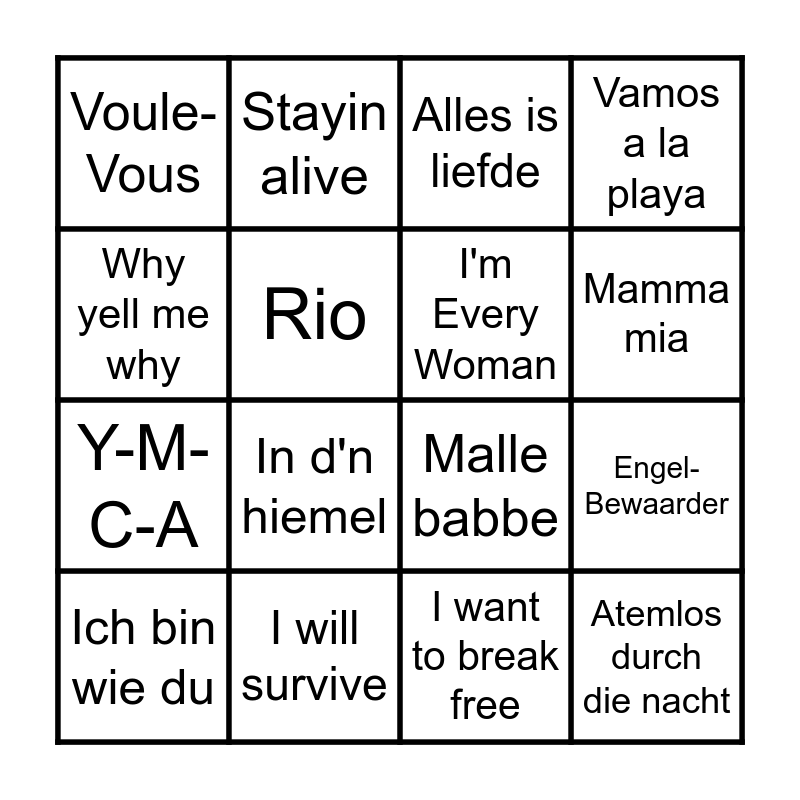 This bingo card has 16 words: Ich bin wie du, I will survive, Alles is liefde, Vamos a la playa, Why yell me why, Stayin alive, Malle babbe, Engel- Bewaarder, Voule-Vous, Rio, I want to break free, Mamma mia, Y-M-C-A, In d'n hiemel, I'm Every Woman and Atemlos durch die nacht.