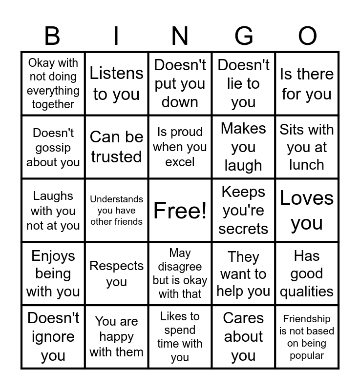 This bingo card has a free space and 24 words: Respects you, You are happy with them, Is proud when you excel, Doesn't ignore you, Is there for you, Okay with not doing everything together, Doesn't gossip about you, Listens to you, Keeps you're secrets, May disagree but is okay with that, Makes you laugh, Laughs with you not at you, They want to help you, Has good qualities, Can be trusted, Cares about you, Loves you, Doesn't put you down, Sits with you at lunch, Understands you have other friends, Friendship is not based on being popular, Enjoys being with you, Doesn't lie to you and Likes to spend time with you.