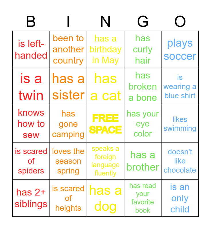 This bingo card has a free space and 24 words: has 2+ siblings, loves the season spring, has a cat, has read your favorite book, plays soccer, is left-handed, been to another country, has a birthday in May, has your eye color, likes swimming, knows how to sew, has a sister, has a brother, doesn't like chocolate, is a twin, is scared of heights, has a dog, has curly hair, is wearing a blue shirt, is scared of spiders, has gone camping, speaks a foreign language fluently, has broken a bone and is an only child.