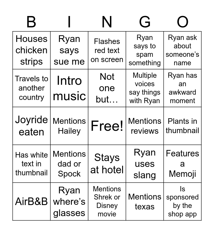 This bingo card has a free space and 29 words: AirB&B, 🔥, Mentions Hailey, Includes McDonald’s, Houses chicken strips, Flashes red text on screen, Intro music, Mentions dad or Spock, Mentions reviews, Ryan where’s glasses, Plants in thumbnail, Is sponsored by the shop app, Mentions Shrek or Disney movie, Mentions texas, Ryan has an awkward moment, Money mentioned, Stays at hotel, Has white text in thumbnail, Ryan ask about someone’s name, Joyride eaten, Ryan uses slang, How bout a room tour, Multiple voices say things with Ryan, Travels to another country, Ryan says to spam something, Ryan says sue me, Features a Memoji, Not one but… and Ryan pauses before a joke.