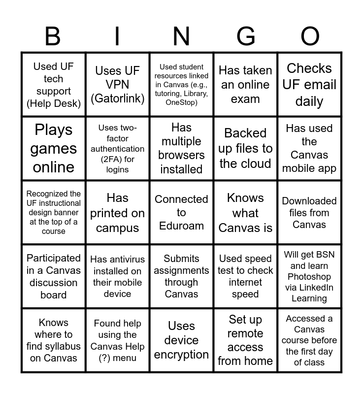 This bingo card has 49 words: Free!, Connected to Eduroam, Has a MAC, Uses device encryption, Has antivirus installed on their mobile device, Attended a Zoom meeting, Uses UF VPN (Gatorlink), Knows the difference between phishing and fishing, Plays games online, Charges devices overnight, Uses two-factor authentication (2FA) for logins, Has taken an online exam, Will get BSN and learn Photoshop via LinkedIn Learning, Used speed test to check internet speed, Cleared browser history recently, Doesn’t have a cracked phone screen, Has multiple browsers installed, Knows what Canvas is, Keeps software up to date, Checks UF email daily, Has printed on campus, Set up remote access from home, Used UF tech support (Help Desk), Backed up files to the cloud, Used LinkedIn Learning, Has used the Canvas mobile app, Knows where to find syllabus on Canvas, Watches recorded lectures on Canvas, Submits assignments through Canvas, Participated in a Canvas discussion board, Uses the Canvas calendar to track assignments, Took a quiz or exam in Canvas, Checked grades via Canvas Gradebook, Uses Canvas notifications, Found help using the Canvas Help (?) menu, Accessed course modules in Canvas, Opened an external tool (e.g., Honorlock, Zoom, or Perusall) via Canvas, Viewed instructor feedback on Canvas, Downloaded files from Canvas, Watched a video embedded in a Canvas course, Clicked “Mark as Done” in a Canvas module, Used the "To Do" list on the Canvas dashboard, Accessed a Canvas course before the first day of class, Completed a Canvas course survey or evaluation, Recognized the UF instructional design banner at the top of a course, Used student resources linked in Canvas (e.g., tutoring, Library, OneStop), Joined a Zoom session via a Canvas link, Located the UF Honorlock exam proctoring info in Canvas and Read a weekly overview or announcement in a Canvas course.