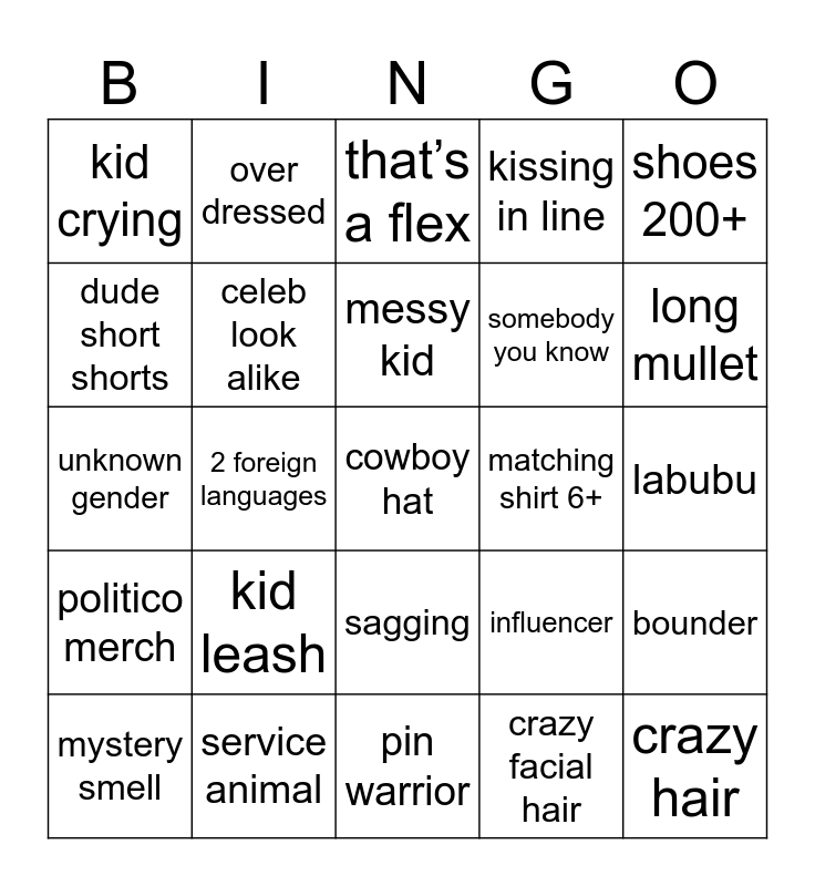 This bingo card has a free space and 24 words: kid leash, service animal, messy kid, mystery smell, shoes 200+, kid crying, dude short shorts, over dressed, matching shirt 6+, sagging, somebody you know, unknown gender, influencer, bounder, celeb look alike, crazy facial hair, labubu, that’s a flex, long mullet, 2 foreign languages, crazy hair, politico merch, kissing in line and pin warrior.