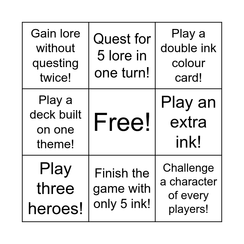 This bingo card has a free space and 8 words: Play an extra ink!, Play a double ink colour card!, Quest for 5 lore in one turn!, Play three heroes!, Gain lore without questing twice!, Challenge a character of every players!, Play a deck built on one theme! and Finish the game with only 5 ink!.