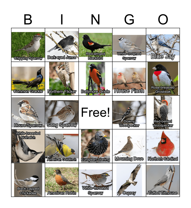 This bingo card has 24 images, a free space and 24 words: American Goldfinch, American Robin, Baltimore Oriole, Black-capped Chickadee, Blue Jay, Chipping Sparrow, Common Grackle, Dark-eyed Junco, Downy Woodpecker, European Starling, House Finch, House Sparrow, Mourning Dove, Northern Cardinal, Northern Flicker, Osprey, Red-bellied Woodpecker, Red-winged Blackbird, Rose-breasted Grosbeak, Song Sparrow, Tufted Titmouse, White-breasted Nuthatch, White-crowned Sparrow and White-throated Sparrow.