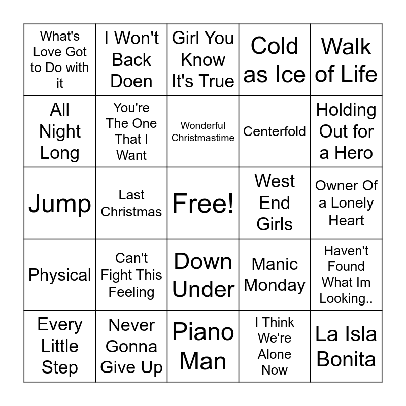 This bingo card has a free space and 35 words: Smooth Criminal, Comfortably Numb, Sailing, You're The One That I Want, Down Under, Cold as Ice, All Night Long, Let's Dance, Wonderful Christmastime, Karma Chameleon, Jump, Walk of Life, In The Air Tonight, Lets Go Crazy, What's Love Got to Do with it, West End Girls, I Think We're Alone Now, Last Christmas, Physical, La Isla Bonita, Manic Monday, Every Little Step, Haven't Found What Im Looking.., Never Gonna Give Up, Girl You Know It's True, Holding Out for a Hero, Kickstart My Heart, Footloose, Centerfold, Owner Of a Lonely Heart, Hip to be Square, Piano Man, Can't Fight This Feeling, I Won't Back Doen and La Bamba.