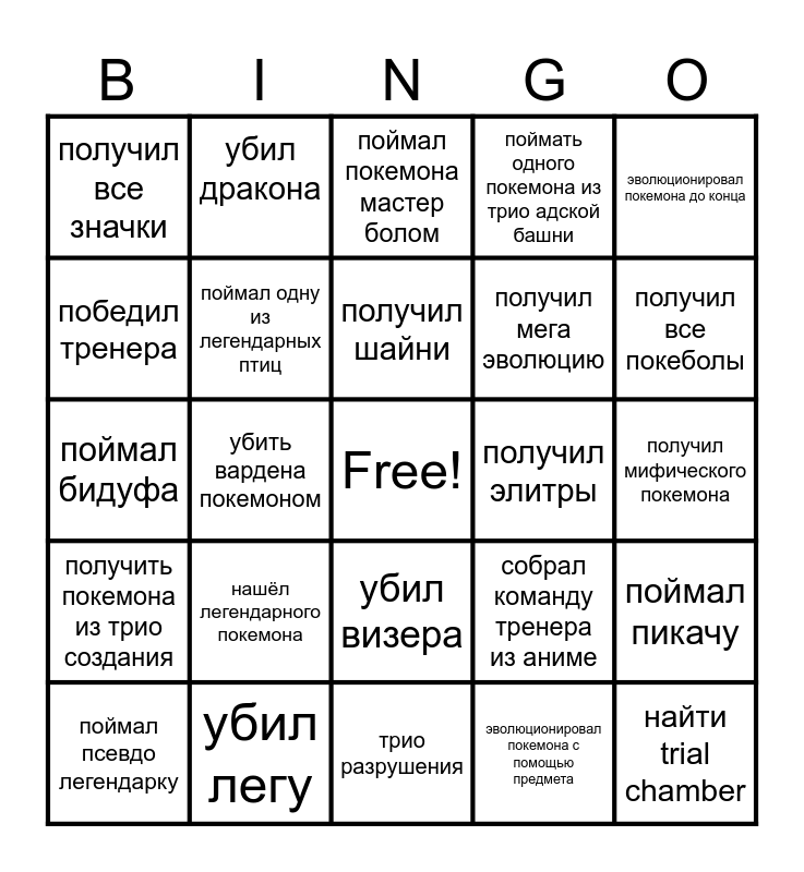 This bingo card has a free space and 24 words: нашёл легендарного покемона, убил легу, получил шайни, поймал псевдо легендарку, эволюционировал покемона до конца, получил все значки, победил тренера, убил дракона, получил элитры, убил визера, получил мега эволюцию, поймал бидуфа, собрал команду тренера из аниме, поймал пикачу, поймал одну из легендарных птиц, эволюционировал покемона с помощью предмета, получил мифического покемона, поймал покемона мастер болом, получил все покеболы, убить вардена покемоном, найти trial chamber, получить покемона из трио создания, поймать одного покемона из трио адской башни and трио разрушения.