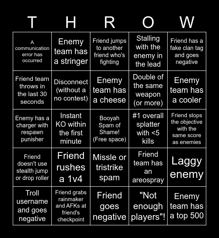 This bingo card has a free space and 50 words: Enemy team has a top 3k, Enemy team has a top 500, Enemy team has a top 10, Friend goes negative, Friend rushes a 1v4, Enemy team has a weapon used by current top 10s, Enemy team has a stringer, Enemy team has a blaster, Friend team throws in the last 30 seconds, No contest, Disconnect (without a no contest), Stalling with the enemy in the lead, Laggy enemy, Friend team has an areospray, Enemy jr has full sub saver, Friend places a cooler in the worst possible spot, Enemy team has a cheese, #1 overall splatter with <5 kills, Enemy team has more than two with the same clan tag, Friend has a fake clan tag and goes negative, Instant KO within the first minute, "Not enough players"!, A communication error has occurred, Double of the same weapon (or more), Friend hugs the Splatling, Friend team has a clash, Enemy team has a cooler, Enemy team has a trizooka, Friend jumps to another friend who's fighting, Missle or tristrike spam, Friends don't push objective, Friend skips the Rainmaker checkpoint, Friend picks up the pity ball when we're recovering from a push, Friend goes afk, Friend grabs rainmaker and AFKs at friend's checkpoint, Friend throws clams off the map, Areospray or Enperry main dies 15+ times, Enemy team has 2+ Series streak, Friend jumps to another friend who's sharking, Friend stops the objective with the same score as enemies, Enemy has a carbon roller, Only good player gives up carrying, "WIPED OUT!!!", Political username, Troll username and goes negative, Enemy has a charger with respawn punisher, Friend has a frontline weapon with respawn punisher, "WIPEOUT!!!", Friend doesn't use stealth jump or drop roller and Friend has 5 star badge with their weapon but plays bad with it.