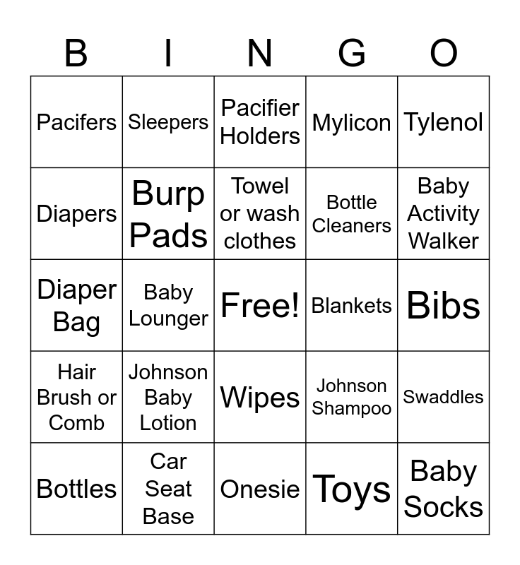 This bingo card has a free space and 24 words: Johnson Baby Lotion, Car Seat Base, Towel or wash clothes, Bottles, Tylenol, Pacifers, Diapers, Sleepers, Blankets, Wipes, Bottle Cleaners, Diaper Bag, Johnson Shampoo, Swaddles, Burp Pads, Toys, Bibs, Pacifier Holders, Baby Activity Walker, Baby Lounger, Baby Socks, Hair Brush or Comb, Mylicon and Onesie.