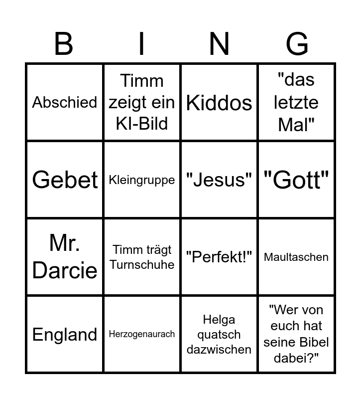 This bingo card has 16 words: Herzogenaurach, Maultaschen, Kiddos, Abschied, Mr. Darcie, Timm zeigt ein KI-Bild, "Perfekt!", Helga quatsch dazwischen, Gebet, Kleingruppe, England, "das letzte Mal", Timm trägt Turnschuhe, "Gott", "Jesus" and "Wer von euch hat seine Bibel dabei?".
