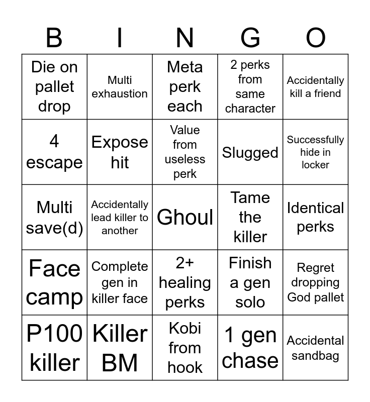 This bingo card has a free space and 42 words: What is that perk?, Value from useless perk, Tunnelled, Complete gen in killer face, 1 gen chase, Regret dropping God pallet, Accidental sandbag, Rage bate builds (all 4), Meta perk each, 2+ healing perks, Identical perks, Successfully hide in locker, Accidentally lead killer to another, Accidentally kill a friend, Leave a gen for no reason, Finish a gen solo, Gen rush, Multi save(d), Get stuck on map, Multi exhaustion, 4 escape, No mither, NOED, Die on pallet drop, Cleanse/boon haunted, Hatch escape, Slugged, Scene partner, 3 universal perks, Get mori'd, Drop shack at 5 gens, Face camp, Expose hit, Kobi from hook, Devour Hope, P100 killer, Killer BM, Tame the killer, Make killer whiff, Hooked in basement, 2 perks from same character and Same character and perk.