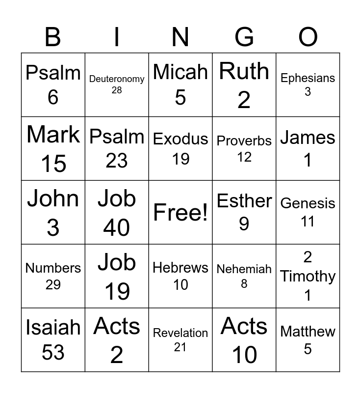 This bingo card has a free space and 24 words: Job 19, Acts 2, Exodus 19, Isaiah 53, Ephesians 3, Psalm 6, Mark 15, Deuteronomy 28, Esther 9, Hebrews 10, Proverbs 12, John 3, Nehemiah 8, 2 Timothy 1, Psalm 23, Acts 10, Genesis 11, Micah 5, James 1, Job 40, Matthew 5, Numbers 29, Ruth 2 and Revelation 21.