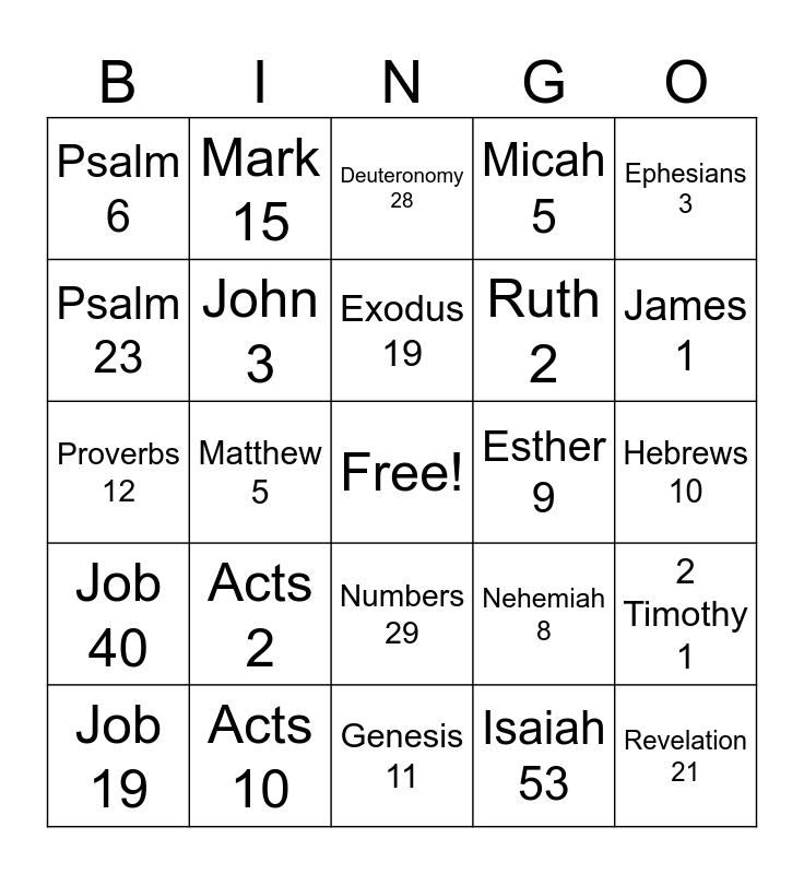 This bingo card has a free space and 24 words: Job 19, Acts 2, Exodus 19, Isaiah 53, Ephesians 3, Psalm 6, Mark 15, Deuteronomy 28, Esther 9, Hebrews 10, Proverbs 12, John 3, Nehemiah 8, 2 Timothy 1, Psalm 23, Acts 10, Genesis 11, Micah 5, James 1, Job 40, Matthew 5, Numbers 29, Ruth 2 and Revelation 21.