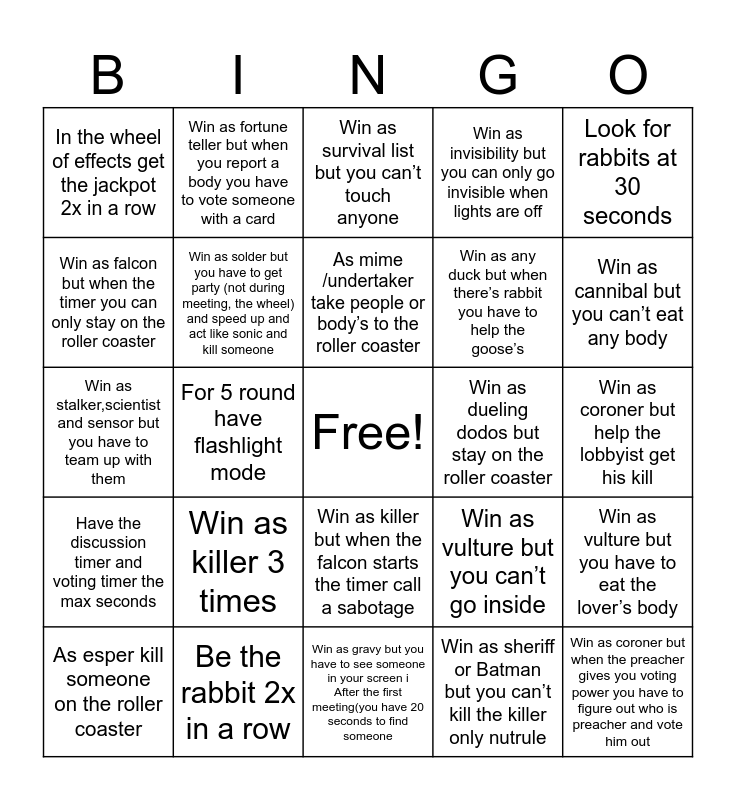 This bingo card has a free space and 24 words: Win as killer 3 times, Be the rabbit 2x in a row, As mime /undertaker take people or body’s to the roller coaster, As esper kill someone on the roller coaster, Look for rabbits at 30 seconds, In the wheel of effects get the jackpot 2x in a row, Win as falcon but when the timer you can only stay on the roller coaster, Win as fortune teller but when you report a body you have to vote someone with a card, Win as dueling dodos but stay on the roller coaster, Win as killer but when the falcon starts the timer call a sabotage, Win as any duck but when there’s rabbit you have to help the goose’s, Win as stalker,scientist and sensor but you have to team up with them, Win as vulture but you can’t go inside, Win as vulture but you have to eat the lover’s body, Win as solder but you have to get party (not during meeting, the wheel) and speed up and act like sonic and kill someone, Win as sheriff or Batman but you can’t kill the killer only nutrule, Win as coroner but help the lobbyist get his kill, Win as survival list but you can’t touch anyone, Win as cannibal but you can’t eat any body, For 5 round have flashlight mode, Win as coroner but when the preacher gives you voting power you have to figure out who is preacher and vote him out, Have the discussion timer and voting timer the max seconds, Win as invisibility but you can only go invisible when lights are off and Win as gravy but you have to see someone in your screen i After the first meeting(you have 20 seconds to find someone.