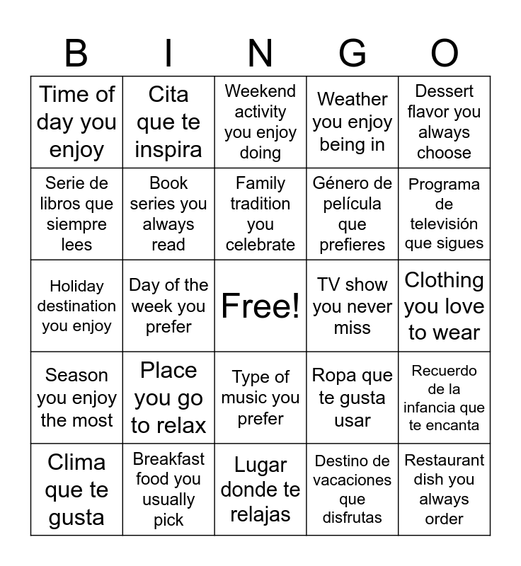 This bingo card has a free space and 40 words: Childhood memory you love, Holiday destination you enjoy, Movie genre you like most, Book series you always read, Breakfast food you usually pick, Type of music you prefer, Family tradition you celebrate, Sport you like to watch, Dessert flavor you always choose, Season you enjoy the most, Day of the week you prefer, Weather you enjoy being in, Restaurant dish you always order, Clothing you love to wear, TV show you never miss, Place you go to relax, Pet you would love to have, Time of day you enjoy, Quote that inspires you, Weekend activity you enjoy doing, Recuerdo de la infancia que te encanta, Destino de vacaciones que disfrutas, Género de película que prefieres, Serie de libros que siempre lees, Comida del desayuno que eliges, Tipo de música que escuchas, Tradición familiar que celebras, Deporte que te gusta ver, Sabor de postre que eliges, Estación del año que disfrutas, Día de la semana que prefieres, Clima que te gusta, Plato del restaurante que siempre pides, Ropa que te gusta usar, Programa de televisión que sigues, Lugar donde te relajas, Mascota que te gustaría tener, Momento del día que disfrutas, Cita que te inspira and Actividad del fin de semana que haces.