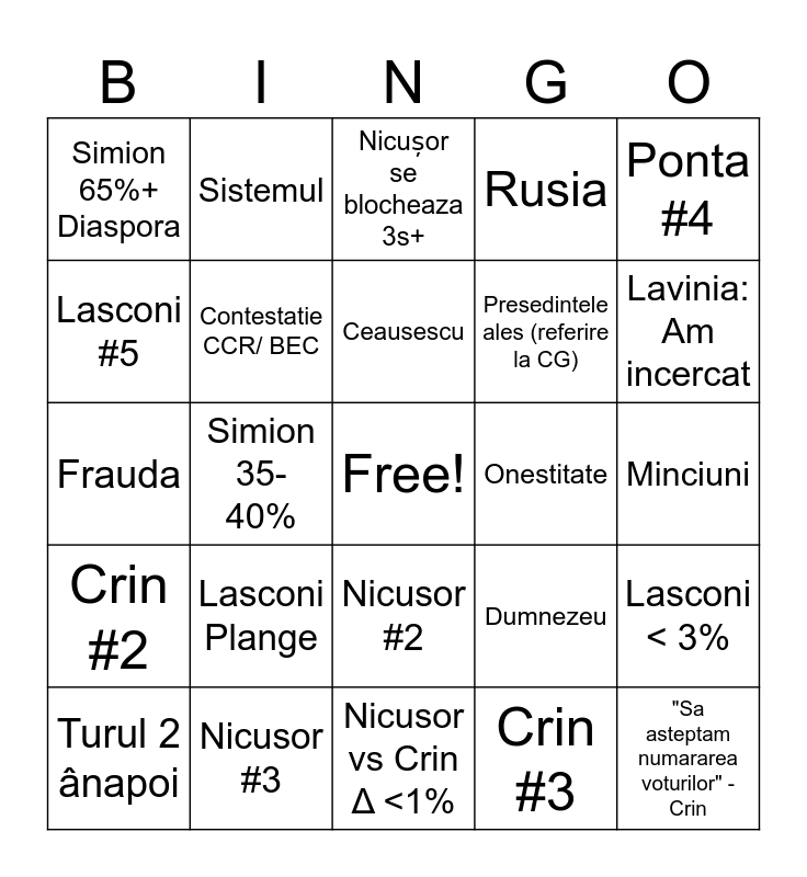 This bingo card has a free space and 24 words: Lasconi Plange, Nicusor #3, Ceausescu, Turul 2 ânapoi, Ponta #4, Simion 65%+ Diaspora, Lasconi #5, Sistemul, Onestitate, Nicusor #2, Presedintele ales (referire la CG), Frauda, Dumnezeu, Lasconi < 3%, Contestatie CCR/ BEC, Crin #3, Minciuni, Nicușor se blocheaza 3s+, Lavinia: Am incercat, Simion 35-40%, "Sa asteptam numararea voturilor" - Crin, Crin #2, Rusia and Nicusor vs Crin Δ <1%.