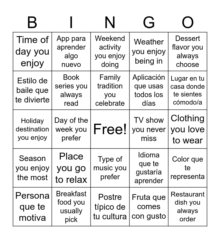 This bingo card has a free space and 40 words: Childhood memory you love, Holiday destination you enjoy, Movie genre you like most, Book series you always read, Breakfast food you usually pick, Type of music you prefer, Family tradition you celebrate, Sport you like to watch, Dessert flavor you always choose, Season you enjoy the most, Day of the week you prefer, Weather you enjoy being in, Restaurant dish you always order, Clothing you love to wear, TV show you never miss, Place you go to relax, Pet you would love to have, Time of day you enjoy, Quote that inspires you, Weekend activity you enjoy doing, Color que te representa, Fruta que comes con gusto, Aplicación que usas todos los días, Estilo de baile que te divierte, País que quieres visitar, Canción que te hace sonreír, Serie animada que te marcó, Café o té que siempre eliges, Actividad que haces cuando estás solo/a, Ciudad que te inspira, Tipo de arte que admiras, Persona que te motiva, Animal salvaje que te interesa, Idioma que te gustaría aprender, Lugar en tu casa donde te sientes cómodo/a, Postre típico de tu cultura, Olor que te trae buenos recuerdos, Juego de mesa que disfrutas, App para aprender algo nuevo and Video viral que recuerdas.