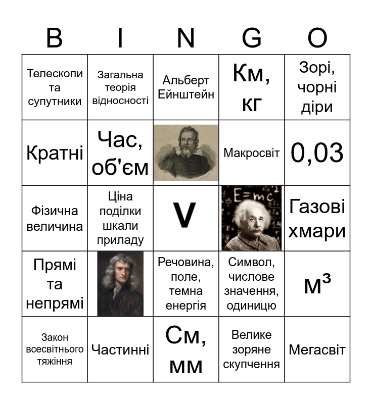 This bingo card has 3 images, a free space and 21 words: Закон всесвітнього тяжіння, Велике зоряне скупчення, Зорі, чорні діри, Телескопи та супутники, Загальна теорія відносності, Альберт Ейнштейн, Газові хмари, Фізична величина, Час, об'єм, Символ, числове значення, одиницю, м³, Кратні, Частинні, См, мм, Км, кг, 0,03, Прямі та непрямі, Ціна поділки шкали приладу, Речовина, поле, темна енергія, Макросвіт and Мегасвіт.