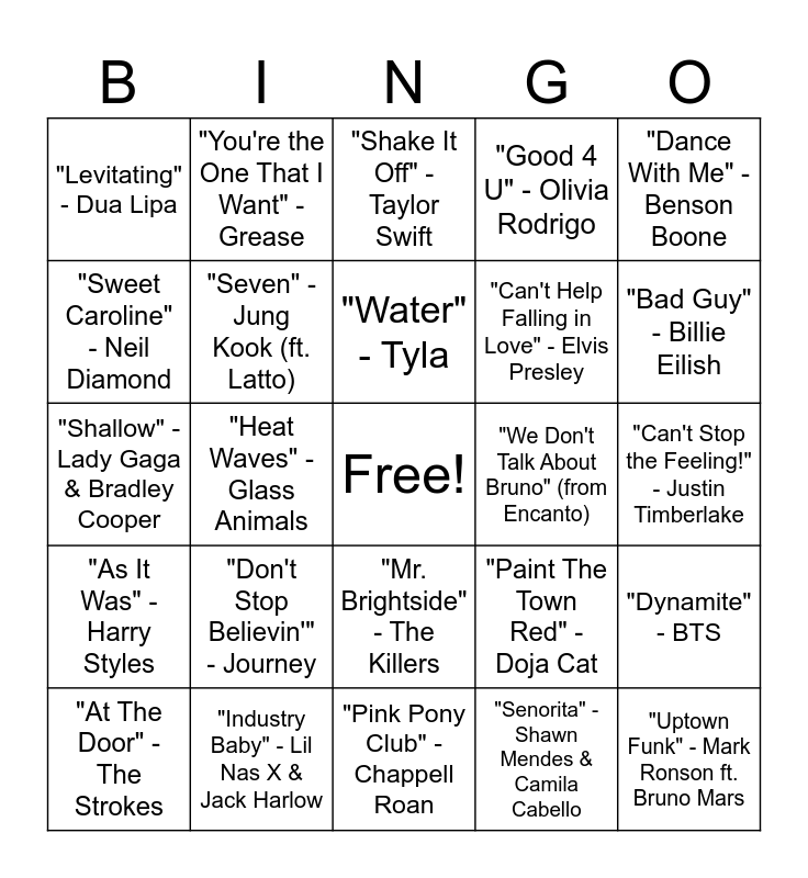 This bingo card has a free space and 36 words: "Dance The Night" - Dua Lipa (from Barbie), "Flowers" - Miley Cyrus, "Vampire" - Olivia Rodrigo, "Seven" - Jung Kook (ft. Latto), "Paint The Town Red" - Doja Cat, "As It Was" - Harry Styles, "Water" - Tyla, "What It Is (Block Boy)" - Doechii, "Dance With Me" - Benson Boone, "Anti-Hero" - Taylor Swift, "Heat Waves" - Glass Animals, "Good 4 U" - Olivia Rodrigo, "drivers license" - Olivia Rodrigo, "We Don't Talk About Bruno" (from Encanto), "Bad Guy" - Billie Eilish, "Levitating" - Dua Lipa, "Bohemian Rhapsody" - Queen, "Don't Stop Believin'" - Journey, "Uptown Funk" - Mark Ronson ft. Bruno Mars, "Shake It Off" - Taylor Swift, "Can't Stop the Feeling!" - Justin Timberlake, "Dynamite" - BTS, "Industry Baby" - Lil Nas X & Jack Harlow, "At The Door" - The Strokes, "Pink Pony Club" - Chappell Roan, "You're the One That I Want" - Grease, "Shallow" - Lady Gaga & Bradley Cooper, "Happy" - Pharrell Williams, "Can't Help Falling in Love" - Elvis Presley, "Sweet Caroline" - Neil Diamond, "Blinding Lights" - The Weeknd, "positions" - Ariana Grande, "Senorita" - Shawn Mendes & Camila Cabello, "Mr. Brightside" - The Killers, "Sweet Child O' Mine" - Guns N' Roses and "All The Small Things" - blink-182.