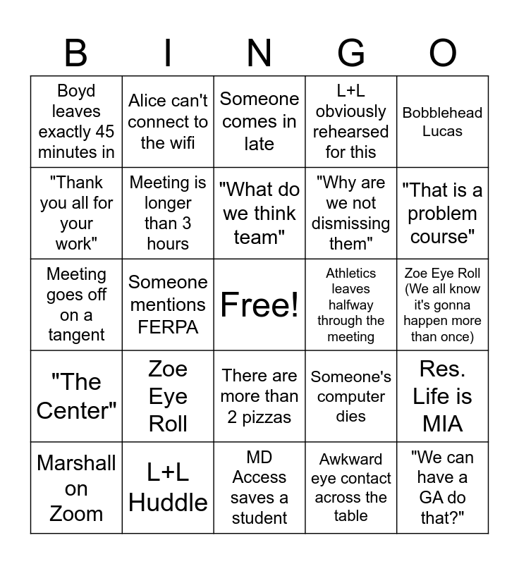 This bingo card has a free space and 24 words: Zoe Eye Roll, L+L Huddle, "What do we think team", Marshall on Zoom, Bobblehead Lucas, Boyd leaves exactly 45 minutes in, "Thank you all for your work", Alice can't connect to the wifi, Athletics leaves halfway through the meeting, There are more than 2 pizzas, "Why are we not dismissing them", Meeting goes off on a tangent, Someone's computer dies, Res. Life is MIA, Meeting is longer than 3 hours, Awkward eye contact across the table, Zoe Eye Roll (We all know it's gonna happen more than once), Someone comes in late, "That is a problem course", Someone mentions FERPA, "We can have a GA do that?", "The Center", L+L obviously rehearsed for this and MD Access saves a student.