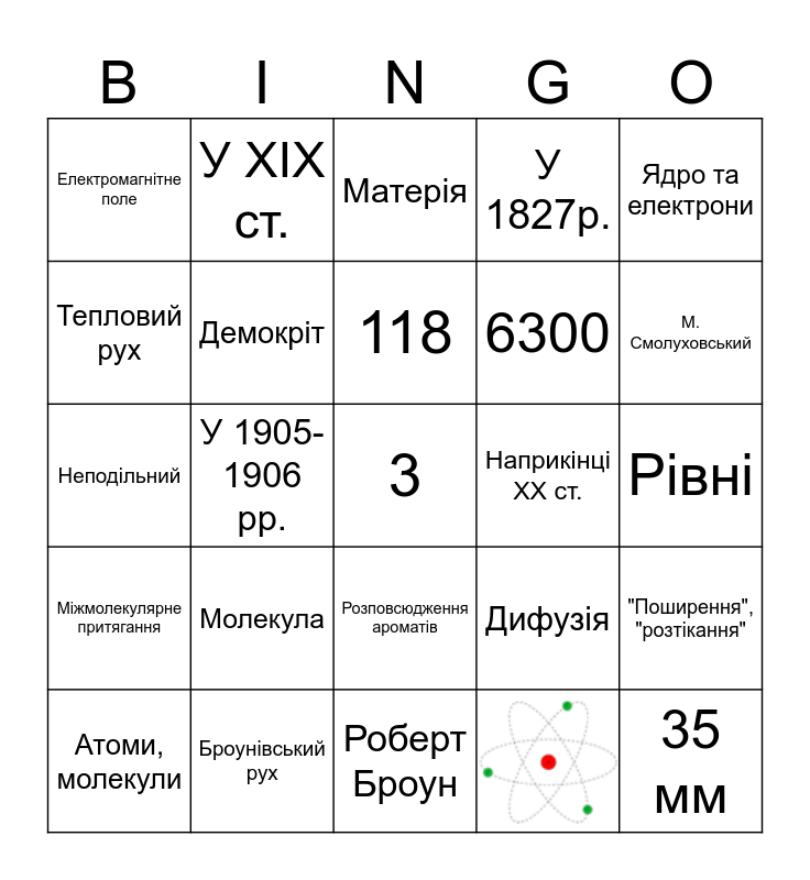 This bingo card has 1 images, a free space and 23 words: Атоми, молекули, Молекула, 118, Ядро та електрони, Електромагнітне поле, У ХІХ ст., Матерія, Наприкінці ХХ ст., Рівні, Неподільний, Демокріт, Дифузія, "Поширення", "розтікання", Тепловий рух, Броунівський рух, Роберт Броун, У 1827р., M. Смолуховський, Міжмолекулярне притягання, У 1905-1906 рр., Розповсюдження ароматів, 6300 and 35 мм.