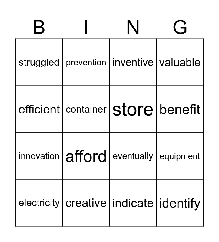 This bingo card has 20 words: equipment, design, inventive, powers, electricity, efficient, creative, struggled, innovation, prevention, afford, eventually, container, identify, store, device, benefit, valuable, indicate and device.