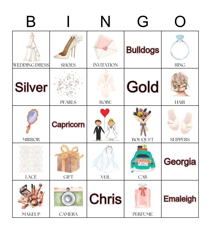 This bingo card has 24 images, a free space and 10 words: Chris, Emaleigh, Bulldogs, Gamecocks, Gold, Silver, Pisces, Capricorn, Georgia and California.