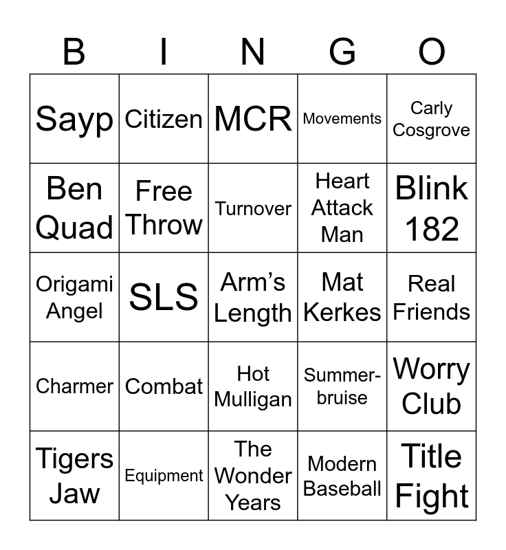 This bingo card has a free space and 24 words: Combat, Equipment, Turnover, Tigers Jaw, Carly Cosgrove, Sayp, Ben Quad, Citizen, Mat Kerkes, Hot Mulligan, Heart Attack Man, Origami Angel, Summer- bruise, Worry Club, Free Throw, Modern Baseball, Real Friends, MCR, Blink 182, SLS, Title Fight, Charmer, Movements and The Wonder Years.