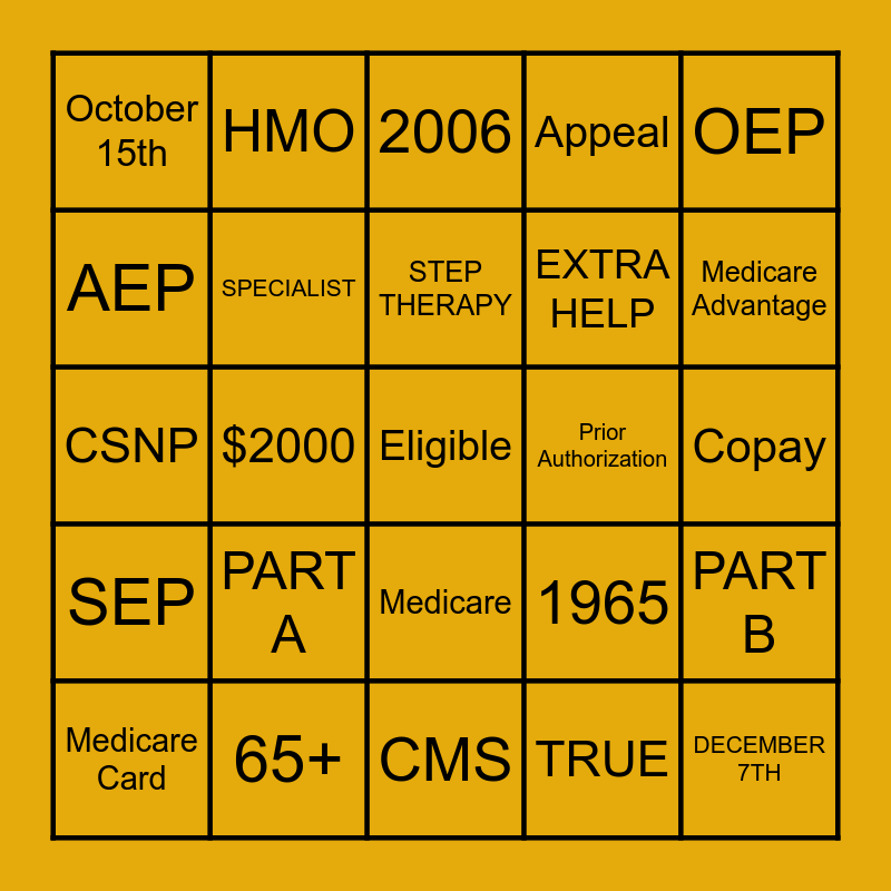 This bingo card has 52 words: DSNP, Eligible, MEDIGAP, CMS, PART A, PCP, HMO, Referral, AEP, PREVENATIVE SERVICES, SPECIALIST, Access, PART B, 1965, DME, Penalty, STEP THERAPY, Prior Authorization, FORMULARY, OEP, $2000, TRUE, October 15th, EXTRA HELP, PART C, DECEMBER 7TH, DRUG TIERS, PPO, Medicare Advantage, $185.00, False, Appeal, Greivance, ESRD, March 31st, 2006, 65+, MOOP, Scope of appointment, Part B deductible, Part D, Copay, SEP, Social security, Medicare, January 1st, Medicaid, CSNP, Bush, Roosevelt, Medicare Card and PACE.