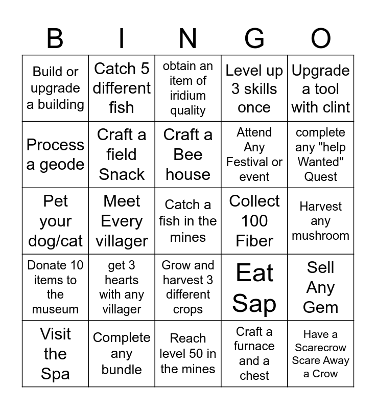 This bingo card has a free space and 24 words: get 3 hearts with any villager, Complete any bundle, Craft a Bee house, Visit the Spa, Upgrade a tool with clint, Build or upgrade a building, Process a geode, Catch 5 different fish, Collect 100 Fiber, Grow and harvest 3 different crops, Attend Any Festival or event, Pet your dog/cat, Eat Sap, Sell Any Gem, Craft a field Snack, Craft a furnace and a chest, Harvest any mushroom, obtain an item of iridium quality, complete any "help Wanted" Quest, Meet Every villager, Have a Scarecrow Scare Away a Crow, Donate 10 items to the museum, Level up 3 skills once and Reach level 50 in the mines.
