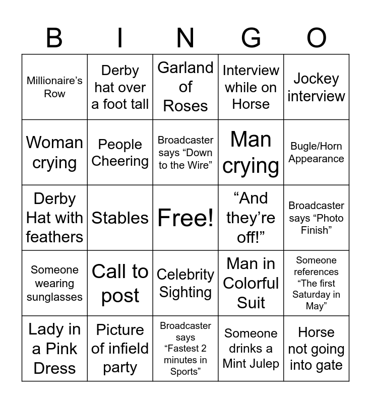 This bingo card has a free space and 29 words: Lady in a Pink Dress, “Rider’s Up”, Stables, Interview with the Winning Owner, Millionaire’s Row, Garland of Roses, People Cheering, Call to post, “And they’re off!”, Picture of infield party, Broadcaster says “Photo Finish”, Horse not going into gate, Broadcaster says “Fastest 2 minutes in Sports”, Someone drinks a Mint Julep, Bugle/Horn Appearance, Jockey wearing Blue, Celebrity Sighting, Someone wearing sunglasses, Jockey interview, Derby Hat with feathers, Man in Colorful Suit, Horse gets spooked, Man crying, Woman crying, Interview while on Horse, Derby hat over a foot tall, Someone references “The first Saturday in May”, Broadcaster says “Down to the Wire” and Reporter sent to Infield to comment on the Party Scene.