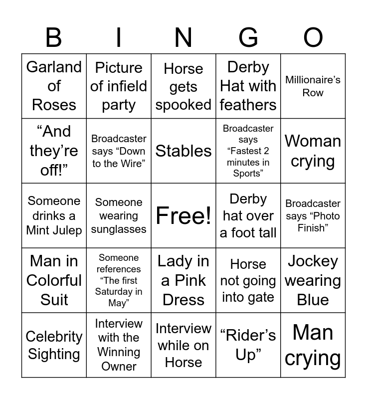 This bingo card has a free space and 26 words: Lady in a Pink Dress, “Rider’s Up”, Stables, Interview with the Winning Owner, Millionaire’s Row, Garland of Roses, “And they’re off!”, Picture of infield party, Broadcaster says “Photo Finish”, Horse not going into gate, Broadcaster says “Fastest 2 minutes in Sports”, Someone drinks a Mint Julep, Jockey wearing Blue, Celebrity Sighting, Someone wearing sunglasses, Jockey interview, Derby Hat with feathers, Man in Colorful Suit, Horse gets spooked, Man crying, Woman crying, Interview while on Horse, Derby hat over a foot tall, Someone references “The first Saturday in May”, Broadcaster says “Down to the Wire” and Reporter sent to Infield to comment on the Party Scene.