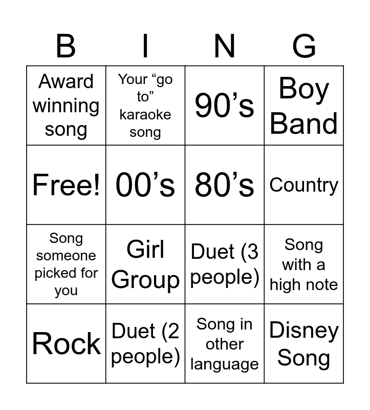 This bingo card has 16 words: Duet (2 people), Song with a high note, 90’s, Award winning song, Song someone picked for you, Your “go to” karaoke song, Duet (3 people), Song in other language, Free!, 00’s, Rock, Boy Band, Girl Group, Country, 80’s and Disney Song.