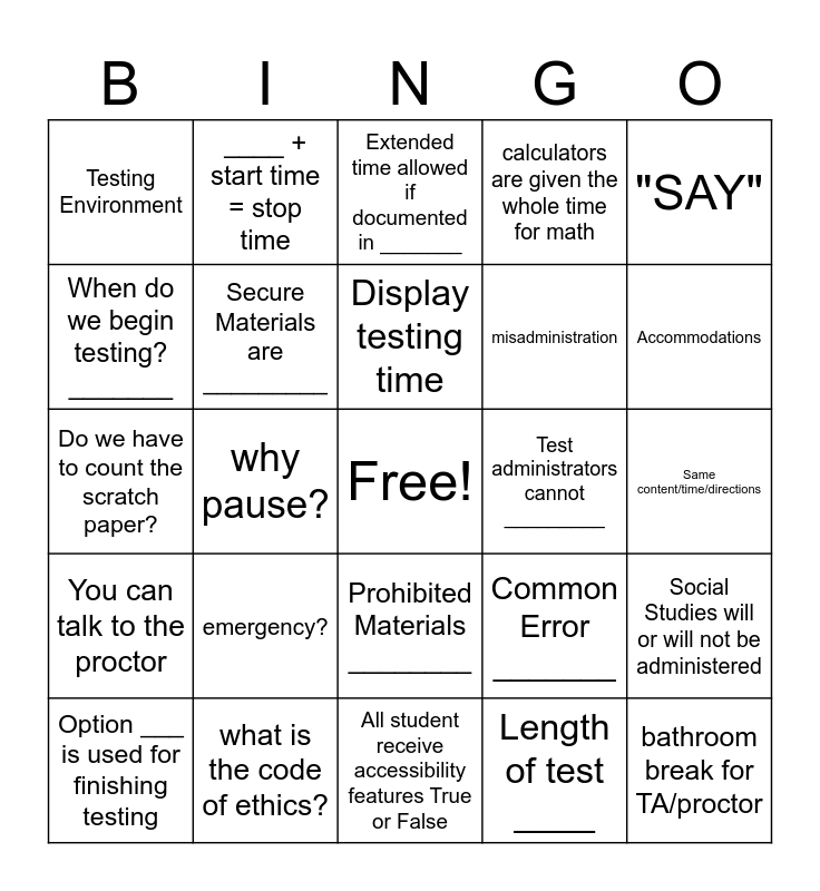 This bingo card has a free space and 28 words: Social Studies will or will not be administered, Headphones for ELA, misadministration, Length of test ____, When do we begin testing? _______, Extended time allowed if documented in _______, ____ + start time = stop time, You can talk to the proctor, Test administrators cannot _________, Option ___ is used for finishing testing, Do we have to count the scratch paper?, calculators are given the whole time for math, what is the code of ethics?, All student receive accessibility features True or False, Accommodations, small group, emergency?, Secure Materials are _________, Display testing time, Prohibited Materials ________, Testing Environment, Actively Proctor, bathroom break for TA/proctor, why pause?, Same content/time/directions, Common Error _______, "SAY" and SAC Sarah and Amy.