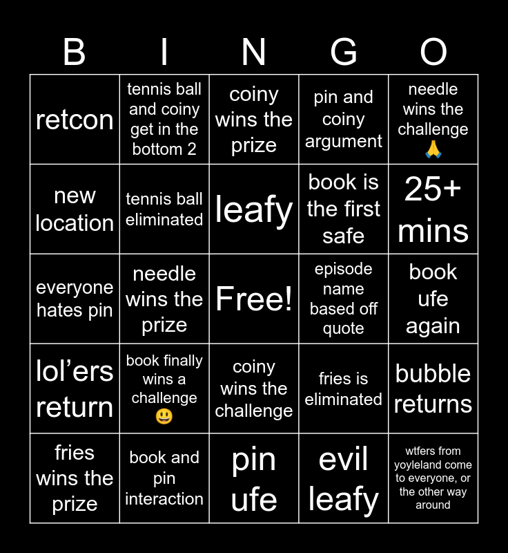 This bingo card has a free space and 24 words: book finally wins a challenge π, book and pin interaction, leafy, fries wins the prize, needle wins the challenge π, retcon, new location, tennis ball and coiny get in the bottom 2, episode name based off quote, coiny wins the challenge, book is the first safe, everyone hates pin, fries is eliminated, bubble returns, tennis ball eliminated, evil leafy, book ufe again, coiny wins the prize, 25+ mins, needle wins the prize, wtfers from yoyleland come to everyone, or the other way around, lolβers return, pin and coiny argument and pin ufe.