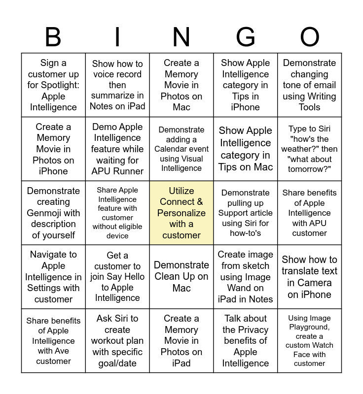 This bingo card has a free space and 36 words: Show Apple Intelligence category in Tips on iPad, Share feature with customer with eligible device identified through C&P, Demonstrate how to blur out faces using Clean Up, Demo Apple Intelligence feature while waiting for APU Runner, Create image from sketch using Image Wand on iPad in Notes, Navigate to Apple Intelligence in Settings with customer, Demonstrate adding a Calendar event using Visual Intelligence, Use Visual Intelligence for recipe from picture of food, Demonstrate changing tone of email using Writing Tools, Show how to Summarize a long news article, Share Apple Intelligence feature with customer without eligible device, Show Apple Intelligence category in Tips in iPhone, Activate Visual Intelligence on a customer's 15 Pro/Pro Max, Demonstrate pulling up Support article using Siri for how-to's, Type to Siri "how's the weather?" then "what about tomorrow?", Sign a customer up for Spotlight: Apple Intelligence, Demonstrate responding to an email with Writing Tools on Mac, Get a customer to join Say Hello to Apple Intelligence, Using Image Playground, create a custom Watch Face with customer, Create a Memory Movie in Photos on Mac, Share benefits of Apple Intelligence with APU customer, Show how to translate text in Camera on iPhone, Ask Siri to create workout plan with specific goal/date, Share benefits of Apple Intelligence with Ave customer, Create a Memory Movie in Photos on iPad, Show how to voice record then summarize in Notes on iPad, Demonstrate creating Genmoji with description of yourself, Ask Siri to write a bedtime story with a specific name, Show Apple Intelligence category in Tips on Mac, Create a Memory Movie in Photos on iPhone, Create contact using Visual Intelligence from a business card, Demonstrate Apple Intelligence on 16e, Talk about the Privacy benefits of Apple Intelligence, Demonstrate Clean Up on Mac, Identify Vancouver Art Gallery with Visual Intelligence and Demonstrate Clean Up on iPad.