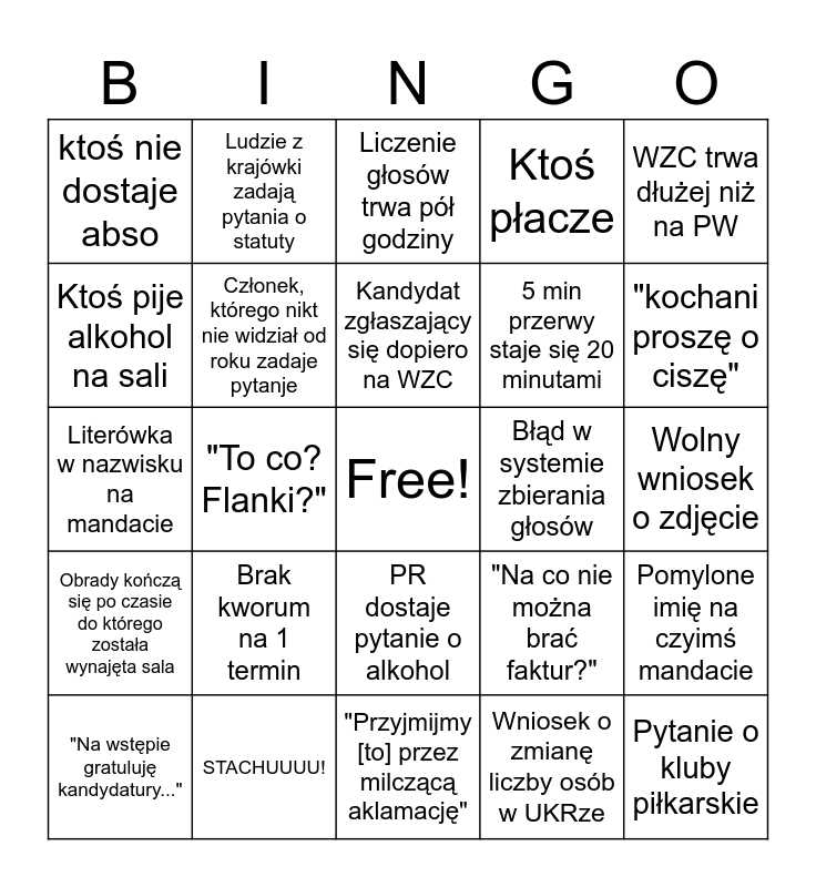 This bingo card has a free space and 25 words: "Na wstępie gratuluję kandydatury...", Brak kworum na 1 termin, Kandydat zgłaszający się dopiero na WZC, Wniosek o zmianę liczby osób w UKRze, "kochani proszę o ciszę", ktoś nie dostaje abso, Ludzie z krajówki zadają pytania o statuty, Liczenie głosów trwa pół godziny, 5 min przerwy staje się 20 minutami, Pomylone imię na czyimś mandacie, Literówka w nazwisku na mandacie, Członek, którego nikt nie widział od roku zadaje pytanje, "Na co nie można brać faktur?", Pytanie o kluby piłkarskie, Ktoś pije alkohol na sali, STACHUUUU!, "Przyjmijmy [to] przez milczącą aklamację", Ktoś płacze, Wolny wniosek o zdjęcie, Obrady kończą się po czasie do którego została wynajęta sala, "To co? Flanki?", PR dostaje pytanie o alkohol, Błąd w systemie zbierania głosów, WZC trwa dłużej niż na PW and Ktoś wyciąga prywatę na WZC.