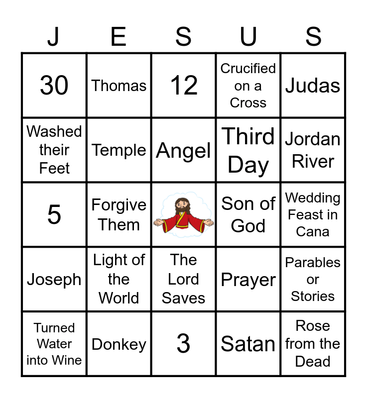 This bingo card has a free space and 59 words: Bethlehem, Donkey, 33, Joseph, Satan, Mary, Temple, 40 days, Third Day, Carpenter, Crucified on a Cross, John the Baptist, Washed their Feet, Miracles, Christmas December 25, 30, Rose from the Dead, Judas, 12 Years Old, Angel, Son of God, 12, Turned Water into Wine, Parables or Stories, Shining Star, Palm Branches, Prayed to God, Peter, Jordan River, Golgotha, Stable, Crown of Thorns, Cross, Make Stones into Bread, Thomas, Save Us from Sin, Eternal Life in Heaven, Forgive Them, 5,000, 5, John 3:16, Light of the World, Wedding Feast in Cana, Lazarus, Come Out!, True, In a Tomb, Peter and John, Bread and Wine, The Lord Saves, 3, His Wife, Mount of Olives, Dove, In a Locked Room in Jerusalem, Heaven, Prayer, Holy Spirit, Pentecost and Share.