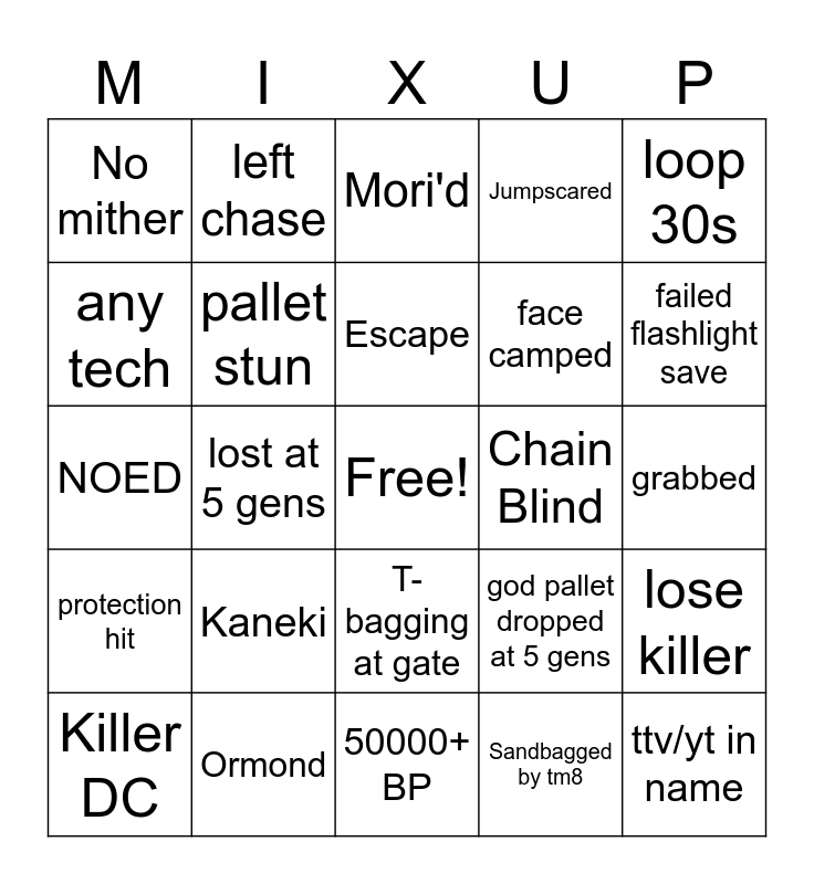 This bingo card has a free space and 24 words: Kaneki, Ormond, Escape, Killer DC, loop 30s, No mither, any tech, left chase, Chain Blind, T-bagging at gate, face camped, NOED, god pallet dropped at 5 gens, lose killer, pallet stun, Sandbagged by tm8, grabbed, Mori'd, failed flashlight save, lost at 5 gens, ttv/yt in name, protection hit, Jumpscared and 50000+ BP.