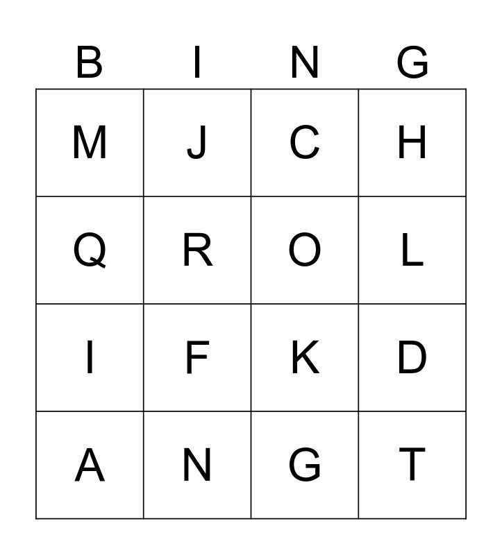 This bingo card has 20 words: A, B, C, D, E, F, G, H, I, J, K, L, M, N, O, P, Q, R, S and T.