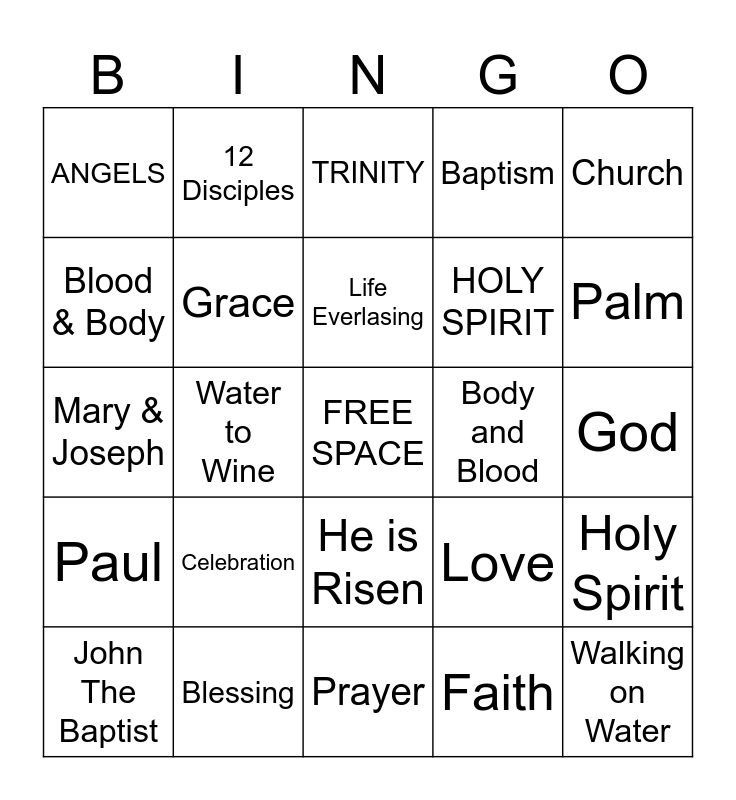 This bingo card has a free space and 29 words: John The Baptist, Eucharist, Water to Wine, JESUS, ANGELS, TRINITY, Grace, Celebration, Body and Blood, Blessing, God, Walking on Water, Prayer, Faith, Palm, Lord's Supper, He is Risen, Paul, Church, Mary & Joseph, Love, Communion, HOLY SPIRIT, Blood & Body, Baptism, 12 Disciples, Holy Spirit, Life Everlasing and Forgiveness.