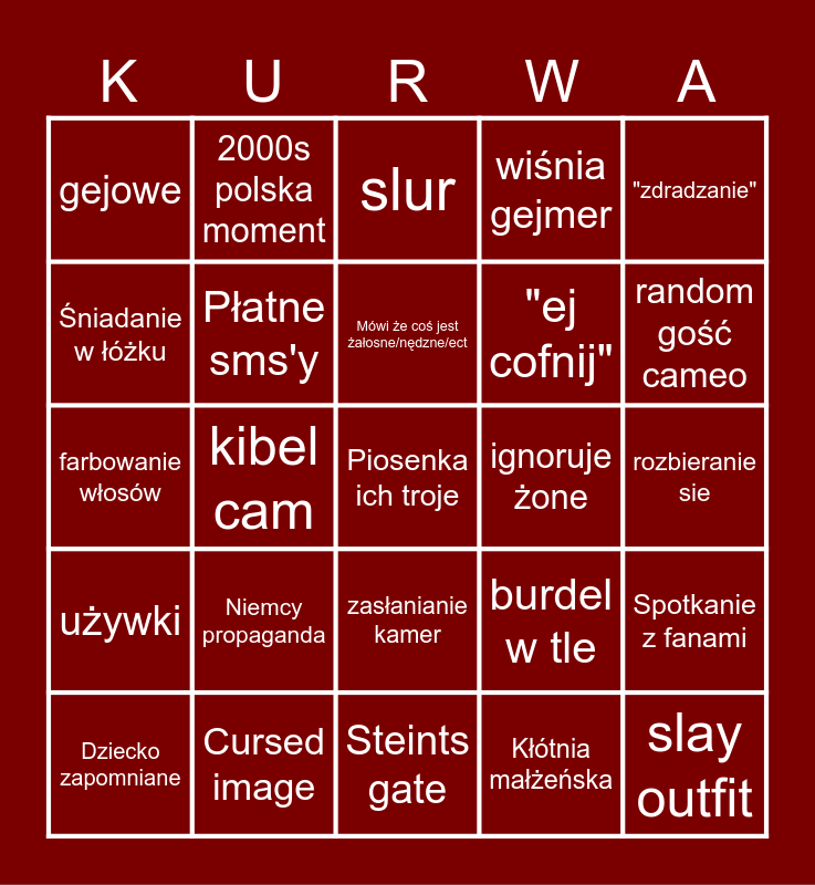 This bingo card has a free space and 24 words: Dziecko zapomniane, Niemcy propaganda, Mówi że coś jest żałosne/nędzne/ect, Kłótnia małżeńska, "zdradzanie", gejowe, 2000s polska moment, slur, ignoruje żone, rozbieranie sie, farbowanie włosów, Płatne sms'y, burdel w tle, Spotkanie z fanami, Śniadanie w łóżku, Cursed image, Steints gate, wiśnia gejmer, random gość cameo, używki, kibel cam, zasłanianie kamer, "ej cofnij" and slay outfit.
