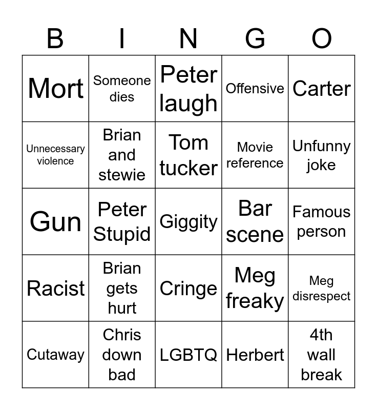 This bingo card has 25 words: Racist, Chris down bad, Giggity, Herbert, Carter, Mort, Someone dies, Peter laugh, Bar scene, Meg disrespect, Unnecessary violence, Brian and stewie, LGBTQ, Meg freaky, Unfunny joke, Cutaway, Peter Stupid, Tom tucker, Movie reference, Famous person, Gun, Brian gets hurt, Cringe, Offensive and 4th wall break.