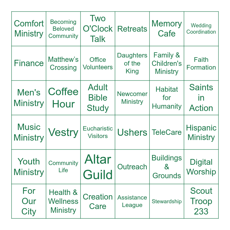 This bingo card has 37 words: Buildings & Grounds, Outreach, Stewardship, Finance, Vestry, Habitat for Humanity, Matthew’s Crossing, Assistance League, Memory Cafe, For Our City, Faith Formation, Retreats, Men's Ministry, Adult Bible Study, Wedding Coordination, Newcomer Ministry, Community Life, Two O'Clock Talk, Saints in Action, Coffee Hour, Comfort Ministry, Daughters of the King, Eucharistic Visitors, TeleCare, Health & Wellness Ministry, Hispanic Ministry, Becoming Beloved Community, Creation Care, Digital Worship, Altar Guild, Liturgical Leaders, Ushers, Family & Children's Ministry, Youth Ministry, Music Ministry, Office Volunteers and Scout Troop 233.