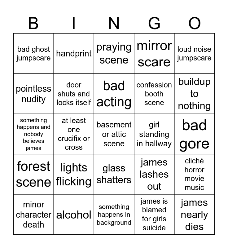 This bingo card has a free space and 24 words: lights flicking, alcohol, bad acting, minor character death, loud noise jumpscare, bad ghost jumpscare, pointless nudity, handprint, girl standing in hallway, glass shatters, confession booth scene, something happens and nobody believes james, james lashes out, cliché horror movie music, door shuts and locks itself, james is blamed for girls suicide, bad gore, praying scene, buildup to nothing, at least one crucifix or cross, james nearly dies, forest scene, mirror scare and something happens in background.