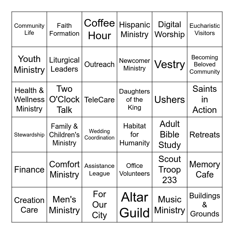 This bingo card has 37 words: Scout Troop 233, Office Volunteers, Music Ministry, Youth Ministry, Family & Children's Ministry, Ushers, Liturgical Leaders, Altar Guild, Digital Worship, Creation Care, Becoming Beloved Community, Hispanic Ministry, Health & Wellness Ministry, TeleCare, Eucharistic Visitors, Daughters of the King, Comfort Ministry, Coffee Hour, Saints in Action, Two O'Clock Talk, Community Life, Newcomer Ministry, Wedding Coordination, Adult Bible Study, Men's Ministry, Retreats, Faith Formation, For Our City, Memory Cafe, Assistance League, Matthew’s Crossing, Habitat for Humanity, Vestry, Finance, Stewardship, Outreach and Buildings & Grounds.
