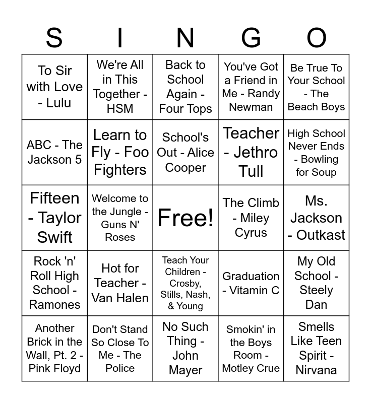 This bingo card has a free space and 24 words: Hot for Teacher - Van Halen, Don't Stand So Close To Me - The Police, School's Out - Alice Cooper, Another Brick in the Wall, Pt. 2 - Pink Floyd, Be True To Your School - The Beach Boys, To Sir with Love - Lulu, ABC - The Jackson 5, We're All in This Together - HSM, The Climb - Miley Cyrus, Teach Your Children - Crosby, Stills, Nash, & Young, Teacher - Jethro Tull, Fifteen - Taylor Swift, Graduation - Vitamin C, My Old School - Steely Dan, Learn to Fly - Foo Fighters, Smokin' in the Boys Room - Motley Crue, Ms. Jackson - Outkast, Back to School Again - Four Tops, High School Never Ends - Bowling for Soup, Welcome to the Jungle - Guns N' Roses, Smells Like Teen Spirit - Nirvana, Rock 'n' Roll High School - Ramones, You've Got a Friend in Me - Randy Newman and No Such Thing - John Mayer.
